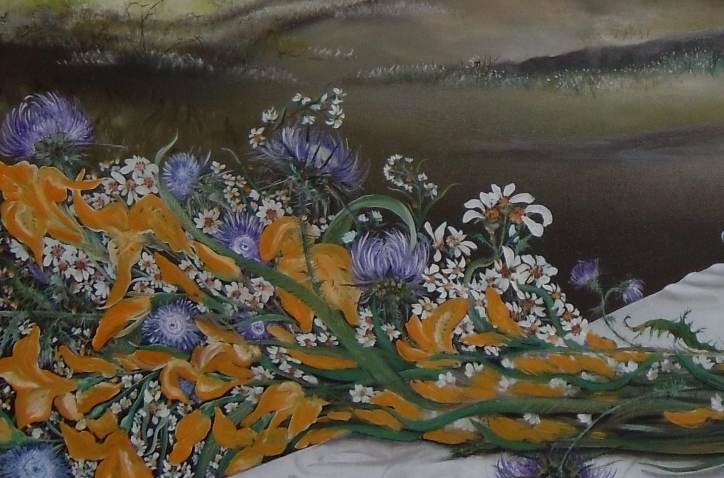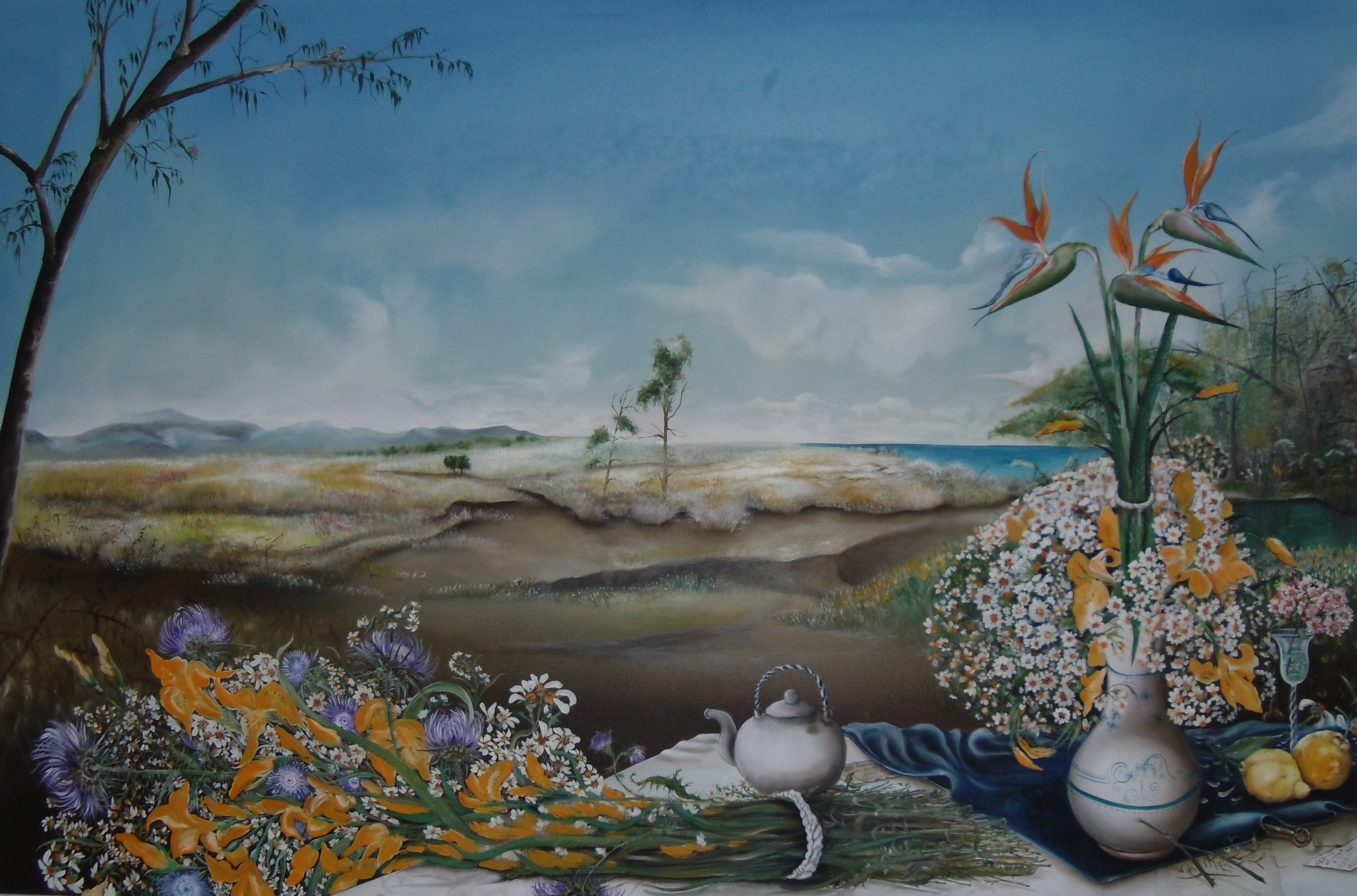 Questo dipinto è un quadro in cui la fusione tra sogni e ricordi e fortemente compenetrata. Sullo sfondo, in prossimità dell’orizzonte, i monti diventano tutt’uno con il mare. Sulla destra un canneto segna il punto in cui il mare incontra il fiume e in primissimo piano una tavola su cui sono stati appoggiati con cura dei fiori, mentre altri sono stati sistemati con cura su un vaso finemente cesellato. Una teiera, un calice e della frutta completano il tutto. In questo caso ogni elemento ha solo una chiave di lettura, tutto è realmente ciò che sembra poiché questo dipinto rappresenta i ricordi d’infanzia rivissuti come in un bel sogno che non vorremmo finisse mai perché riporta alla mente una persona cara che non c’è più. Rivedo le campagne tra il mare ed il fiume dove sono cresciuto e dove trascorrevo le giornate con mia nonna a raccogliere verdure selvatiche e fiori, dove lei mi insegnava i nomi delle piante. La mente mi riporta a quel periodo tra giugno e luglio quando fiorivano gli iris selvatici e quei gigli gialli che le piacevano tanto. Ricordo che raccoglievo e facevo dei grandi mazzi per poi sistemarli sul tavolo una volta a casa; uno lo lasciavo lì e l’altro, con tanti iris, lo portavamo in cimitero, non prima di aver fatto merenda, ed essere stati a parlare a lungo di ciò che la campagna potesse offrire. Questo dipinto è il ricordo di quelle giornate, il profumo selvatico del mare con il fiume e dei fiori di campo, la serenità dell’estate e la pace che infondeva mia nonna. L’immensità di un ricordo che vola via verso un cielo limpido e sereno, in cui la luce racconta ogni storia facendo dimenticare che quelle giornate ormai sono vive solo nei sogni: