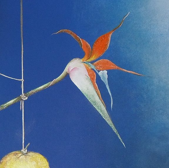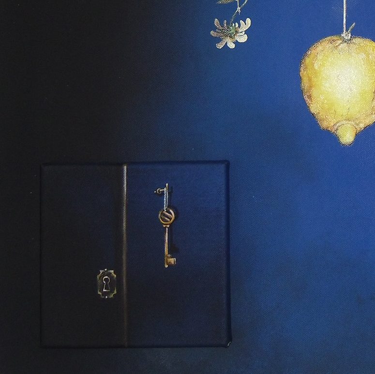 In questa tela, un acrilico e olio, quello che colpisce da subito, e che concentra tutta l’attenzione, è il limone che dal centro del quadro risalta fortemente, entrando in contrasto con la vastità del blu che tutto avvolge. Non può dunque non far pensare ad un sole che bruciando espande la sua luce nel cosmo buio e scuro, illuminando potentemente tutto, emanando energia, e permettendo il fiorire della vita. Il limone rappresenta dunque la forza di volontà che permette la realizzazione e la concretizzazione delle nostre aspirazioni e della nostra volontà e si impone sull’oscurità del cielo che diventa così, in modo antitetico, il simbolo delle paure che attanagliano l’uomo e che non gli permettono di progredire, tenendolo inchiodato in una sorta di limbo popolato di rimpianti e di rimorsi. Tale antitesi perfettamente bilanciata è espressa anche dalla fisicità degli elementi che si contrastano: il limone, pesante, concreto come la realtà, ed il cielo blu, profondo ma etereo, non tangibile fisicamente, ma percettibile solo con la mente, come le paure. Questo gioco di equilibri continua in tutto il quadro: da una parte troviamo una sterlizia regina, simbolo di regalità e signorilità, controbilanciata da una piccola margherita di campo, simbolo quest’ultima di purezza e umiltà. Entrambe poi supportano il peso del limone e tutti questi soggetti sono legati ad un chiodo. Ecco dunque emergere con totale chiarezza il significato di questo dipinto; i sogni (la margherita) che ci spingono ad andare avanti, malgrado le incertezze e le paure (il cielo blu), possono realizzarsi e diventare potenti realtà (sterlizia) se accompagnati da determinazione, positività, ambizione, curiosità e coscienza (limone), senza mai dimenticare la strada che si è scelto di intraprendere (fili) per poter realizzare i propri desideri.