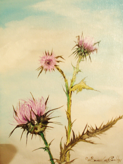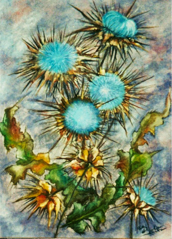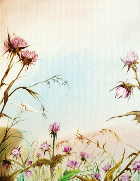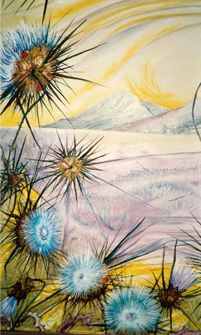 In questa tela più che in altre è forte l’impressione di essere protagonisti di questo dipinto e non soltanto dei semplici osservatori esterni. Infatti i cardi in primissimo piano con il sentiero centrale che sfuma dolcemente verso lo sfondo creano una prospettiva così particolare da sembrare che i fiori, quasi degli uscieri, si pieghino al nostro passaggio con fare reverente acconsentendoci ad entrare in un mondo fantastico, e quel sentiero, quasi dorato, non può non riportare alla mente quello del mondo di Oz e delle sue atmosfere. Ancora una volta insomma veniamo trasportati in una dimensione onirica dove tutto ha il sapore del fantastico, dove il possibile e l’impossibile si fondono insieme ed ogni cosa non sembra più ciò che è ma va letta sotto molteplici punti di vista. I cardi, fiori bellissimi ma spinosi possono essere visti come un segno delle asperità che ci stiamo ormai lasciando alle spalle o come la volontà di interrompere un forzato isolamento che si è andati cercando in quanto sfiduciati da tutto e da tutti. In ogni caso incorniciano un sentiero che, anche se si perde fino all’orizzonte, è comunque foriero di un avvenire migliore che si manifesta già nella varietà multicolorata dei campi ai lati di esso, e da quel cielo di un azzurro terso, solcato da soffici e piacevoli nuvole bianche. Dunque è un dipinto in cui si esprime forte la fiducia verso un nuovo inizio e un domani migliore.